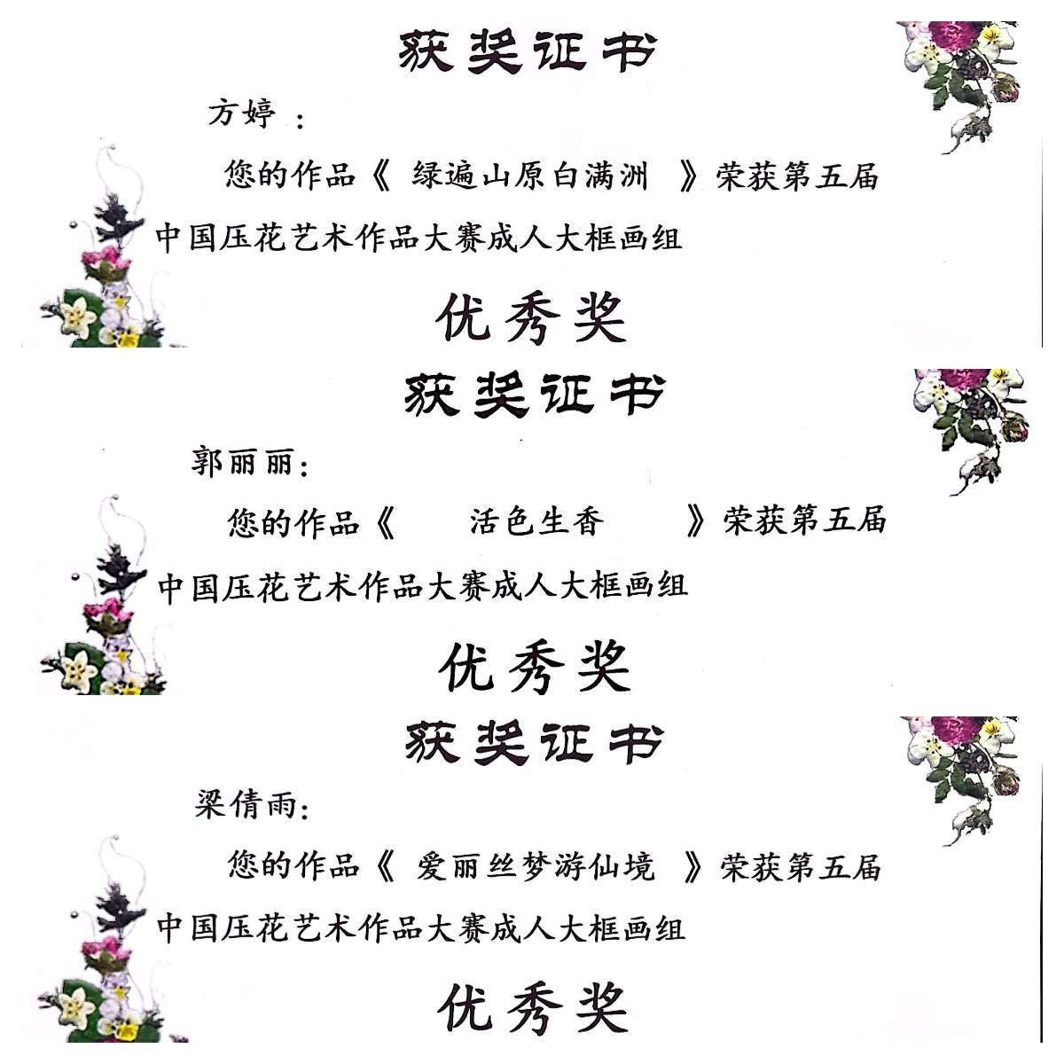 11月26日,第五届中国园艺学会压花作品大赛在华南农业大学园艺公司举行,此次比赛面向全国,成为中国2023年规模最大的压花竞赛。好博体育选拔优秀研究生、本科生代表好博体育官方参赛,党勒、徐喜波作品获第五届中国压花艺术作品大赛成人大框画组三等奖;方婷、郭丽丽、梁倩雨作品获第五届中国压花艺术作品大赛成人大框画组优秀奖,刘翠英教授、张静副教授获优秀指导老师。