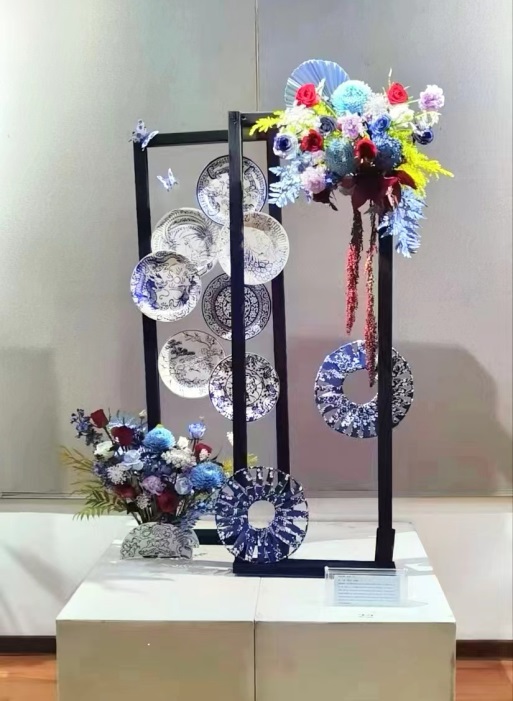 各个高校的参赛作品风格各异,姹紫嫣红,各具千秋。其中,好博体育官方好博体育园林专业员工谢梦阳、刘腾腾的插花作品《四海一心》一路经过初赛、决赛比拼,最终获得二等奖。公司参赛作品由王晓荣教授指导,灵感来源于清雍正青花红彩龙纹圆盘。华夏儿女,炎黄子孙,千秋一统,四海一心。作品整体配色以蓝红色调为主色,搭配金色、紫色等色彩,花材用牡丹菊、高原红、月季搭配千层金,整体色调仿照青花红彩瓷盘,以木质框架为大体结构,营造空间感。整体分为两个结构,大体量花材团代表了中国大陆,下垂的柔丽丝代表着中国南海群岛海域以及海上丝绸之路。