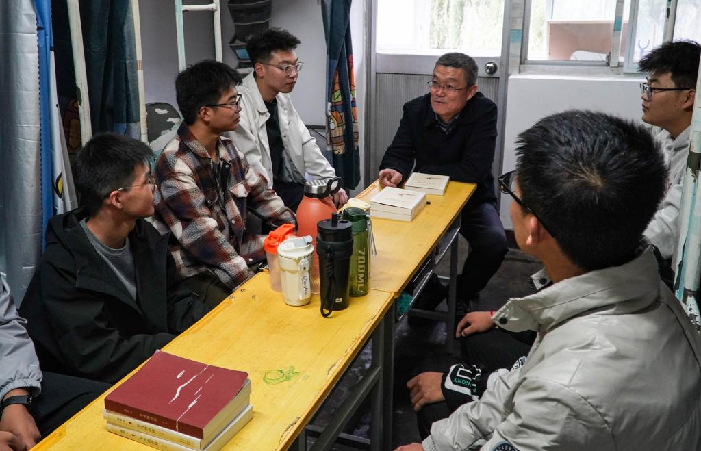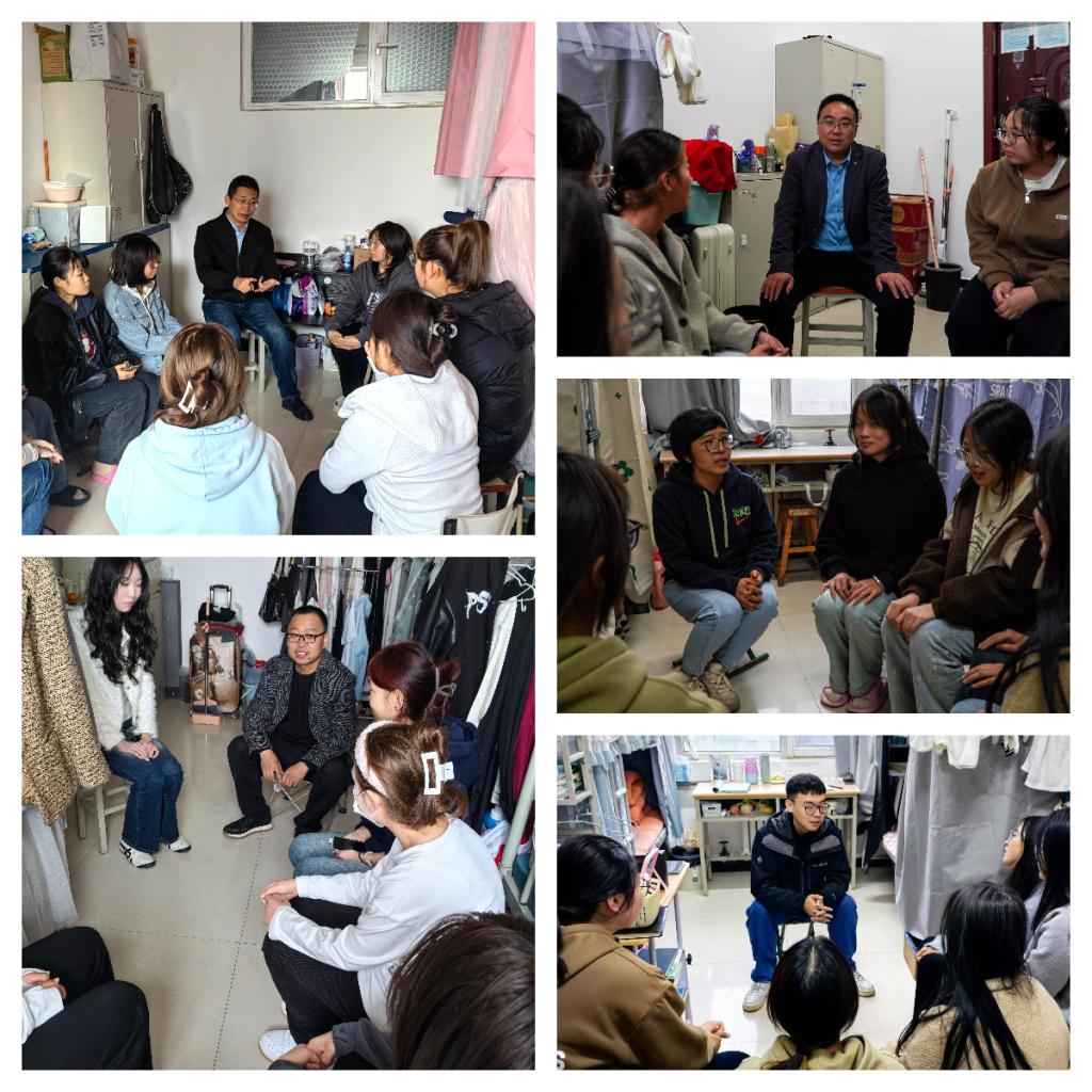 在员工宿舍,百名先进教师志愿服务团成员李强和24级植物科学与技术专业新生分享自己在矿区生态修复上走过的“奋斗路”。陕西省陕北绒山羊工程技术研究中心副主任朱海鲸和动物科学专业员工讲述陕北绒山羊产业在乡村振兴上的“致富路”。辅导员班主任们也分别深入宿舍,了解员工们在生活、学习和人际交往上的需求和困扰。