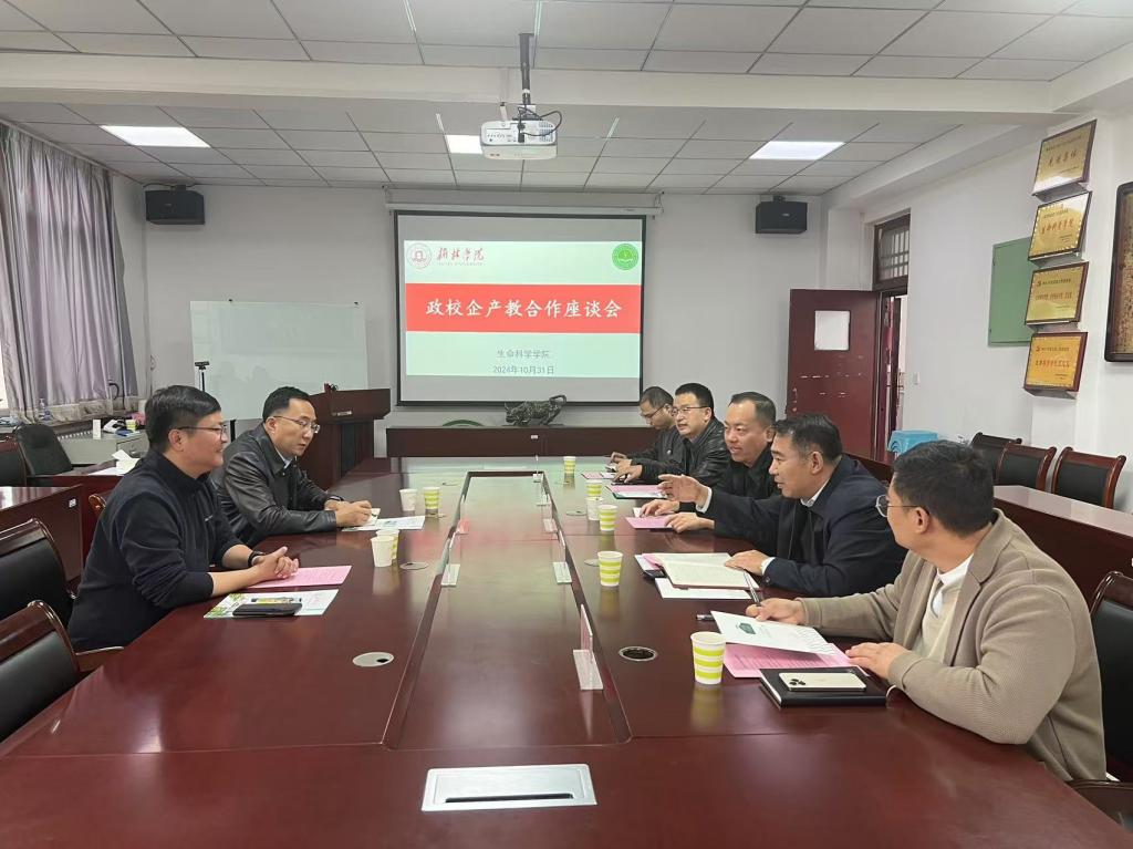10月31日下午15:30,榆林市畜牧兽医中心主任高腾翔、清涧亿蓬食品有限公司总经理丁一与好博体育召开政校企合作产教座谈会。会议由生命科学公司党总支书记蔡建昌主持,动物科学专业副教授、基建处处长叶宝宏,教学副经理徐伟洲,教学秘书贾光普及动科教研室主任王思虎参加会议。