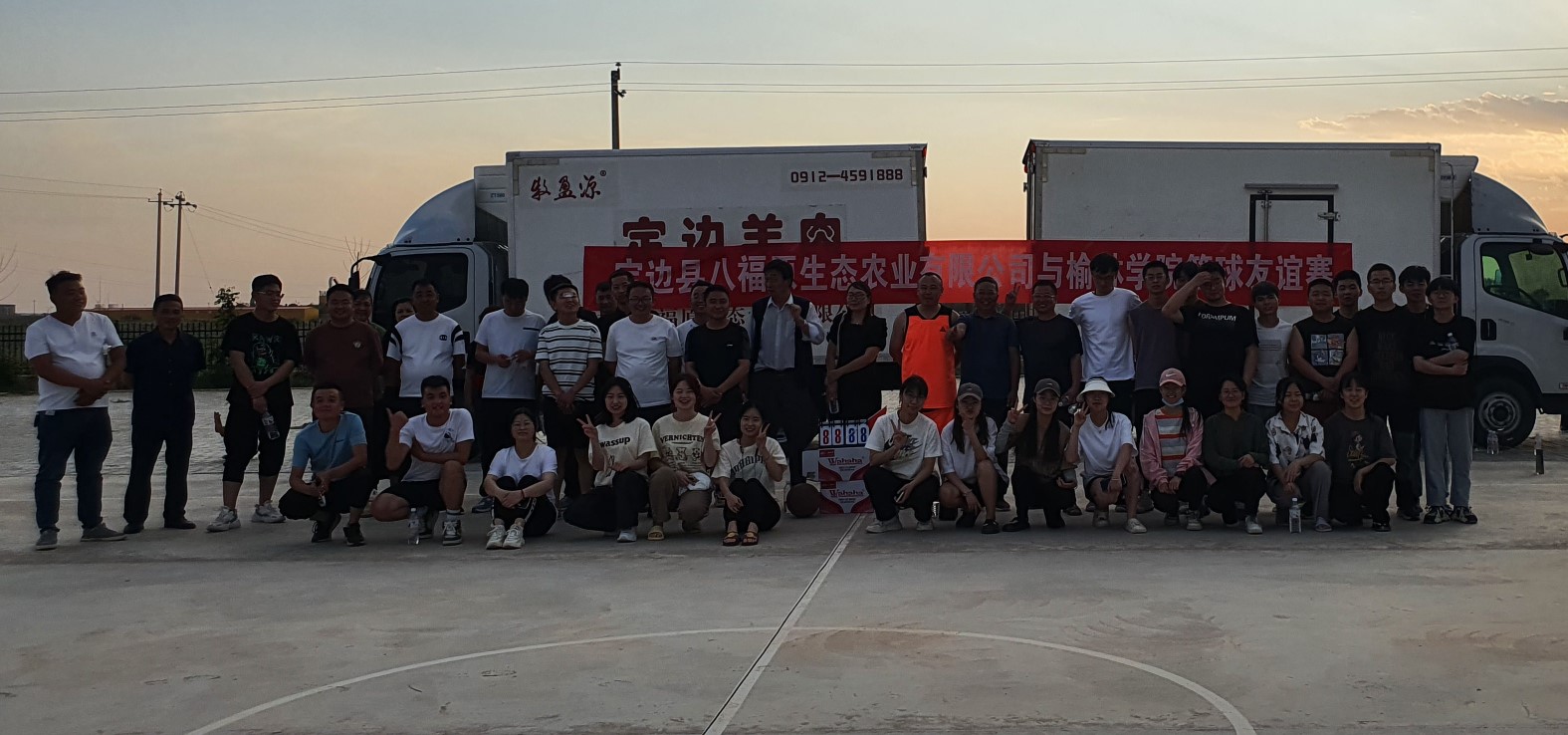 2020级动物科学专业员工在屈雷教授、敬晓棋教授、翟军军老师等的带领下,赴定边县八福原生态农业有限公司开展为期10天的综合实习。为了丰富员工实习生活、深化产教融合和增强校企合作,6月10日下午,公司20级动科师生与定边县八福原生态农业有限公司员工进行了一场校企篮球友谊赛。