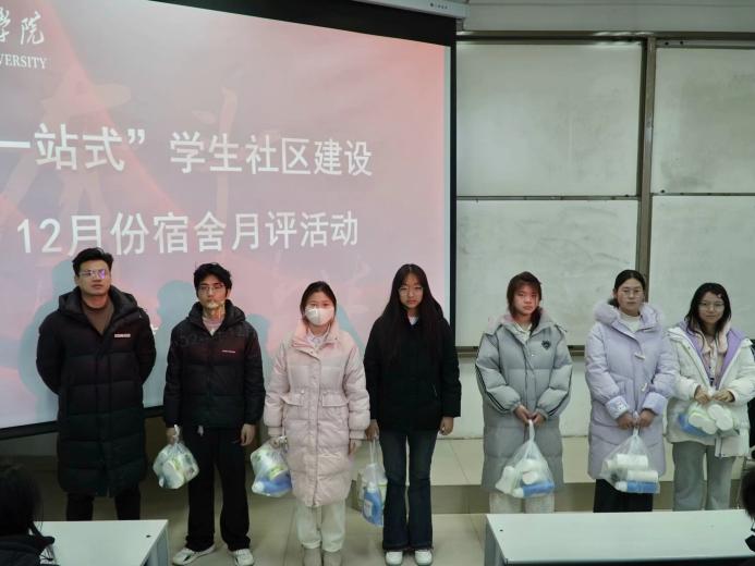 会上,严之栋宣读优秀宿舍名单。关洋洋、张晓晨分别为12月宿舍文明情况“优秀”的宿舍代表颁发奖品。何林卫总结了全年好博体育宿舍月评活动的开展和“一站式”员工社区宿舍检查情况。他提出了以下四点要求:一是宿舍中禁止养宠物,喝酒等行为。二是宿舍中杜绝出现白天卧床睡觉和打游戏现象。临近期末,应当积极复习备考,努力学习,诚信应考。三是宿舍长要承担起自己的职责,关注宿舍内部人员的情况,发现因考试有特殊行为和情况,及时和班主任反馈。四是放假离校前一定要做好卫生清洁工作,宿舍断水断电。