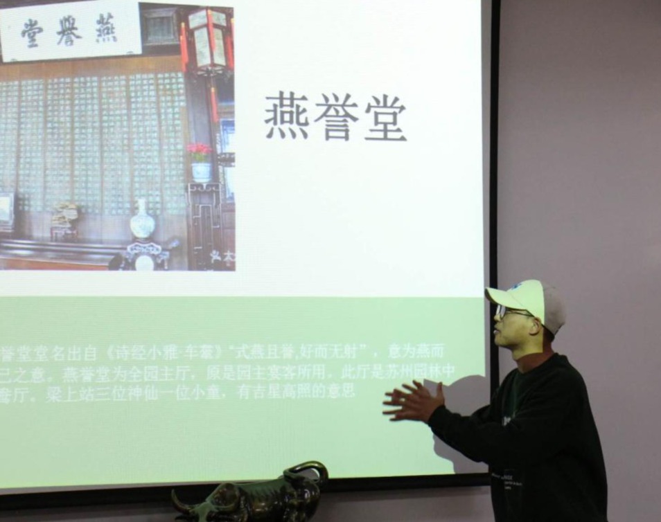 张野分别从拙政园的历史背景、历史变迁、历史地位、山水意境、文化内涵以及植物配置和特色向同学们介绍了拙政园,通过展示视频,带领一众听众感受了拙政园四时各异的风景。吴乐乐通过图片展示了留园的典朴古雅的建筑和秀丽迷人的风景,通过文字分享了团队的观察与思考。她表示,此次实习使他们丰富了理论知识,增强了实践能力,加强了团队协作的能力,增强了环保意识。郭浩浩分享了“假山王国”狮子林,他表示,苏州园林虽有108个园林,但狮子林却是唯一的一座禅意园林。他通过分享真趣亭的小故事、鸳鸯亭的别致建筑、月牙桌的科普知识以及卧云室的别致景观,使在场的师生仿佛走进了这座别致的园林。