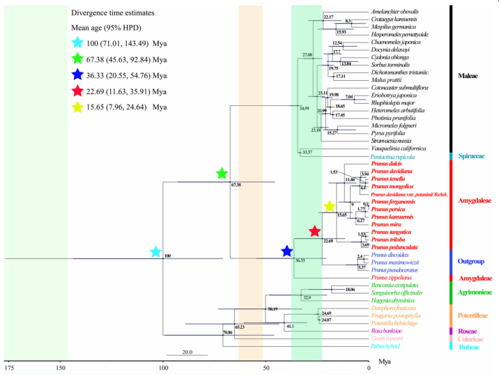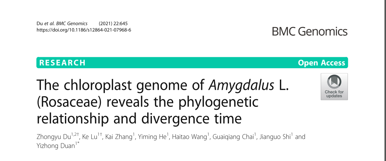 近日,国际著名期刊BMC Geneious(中科院分区为2区,IF=3.969)在线发表题为“The chloroplast genome of Amygdalus L. (Rosaceae) reveals the phylogenetic relationship and divergence time”的研究论文。该文阐述了12个桃属物种叶绿体基因组特征、系统发育及分化时间。