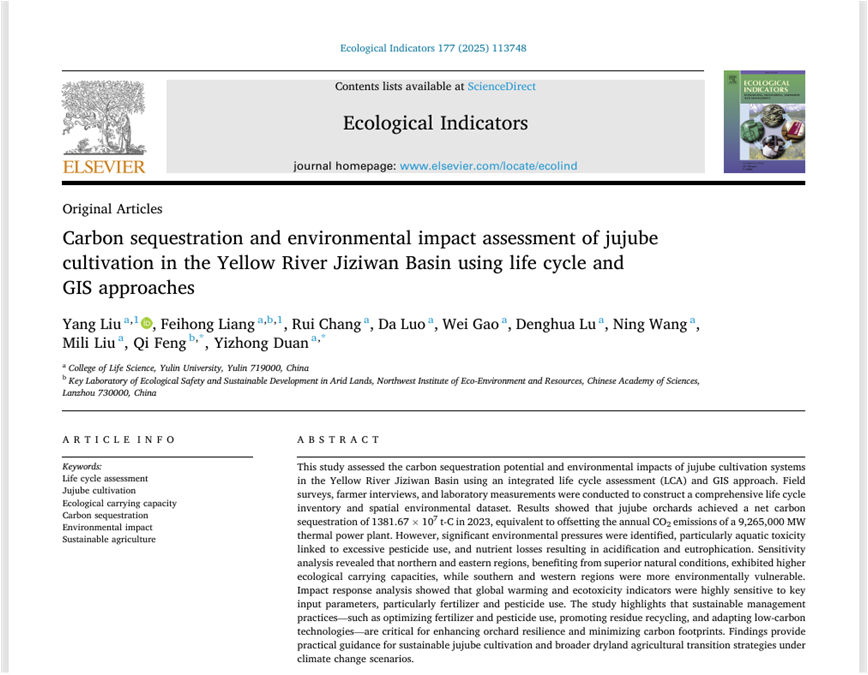 6月8日,公司研究生刘洋在环境生态学领域国际权威期刊《Ecological Indicators》(中科院一区TOP IF 7.0)在线发表了题为"Carbon sequestration and environmental impact assessment of jujube cultivation in the Yellow River Jiziwan Basin using life cycle and GIS approaches"的研究论文。该研究由公司2023级硕士研究生刘洋和梁飞虹副教授共同担任第一作者,公司段义忠教授为通讯作者,好博体育官方为第一完成单位。研究团队通过整合生命周期评价(LCA)与地理信息系统(GIS)技术,首次系统评估了黄河几字湾流域红枣种植系统的碳汇潜力与环境效应。