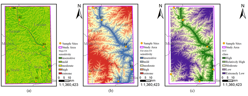 sensitivity analysis in research region. (a) (b) Sensitivity of slope, height; (c) Ecological carrying capacity map of the study area