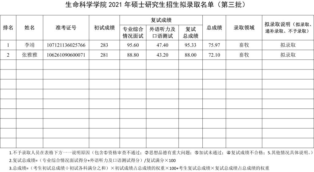 公司于2021年3月30日组织了硕士研究生招生第三批调剂复试录取工作。根据最终成绩,经院系评定,研究生院审核并报校招生工作领导小组审定,现将拟录取名单予以公示,如有异议,请于2021年4月9日前以书面形式报公司研究生招生办公室,逾期不予受理。