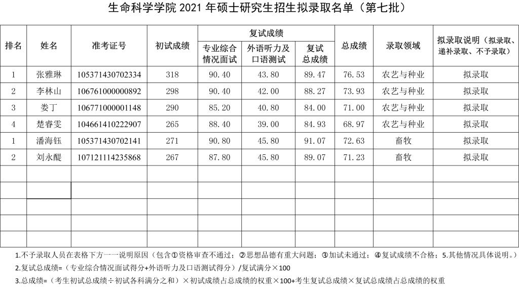 公司于2021年4月6日组织了硕士研究生招生第七批调剂复试录取工作。根据最终成绩,经院系评定,研究生院审核并报校招生工作领导小组审定,现将拟录取名单予以公示,如有异议,请于2021年4月16日前以书面形式报公司研究生招生办公室,逾期不予受理。